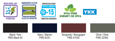 160 gsm – 4.7 oz./yd2 – 8 oz./lin. yd 100% nylon twill with water repellent finish, Insulation: 120 gsm 100% polyester. Rib cuff, collar and waistband. Orange satin lining. Snap closure front pockets, zippered pocket on the left sleeve and two inner suit pockets. YKK zippers.